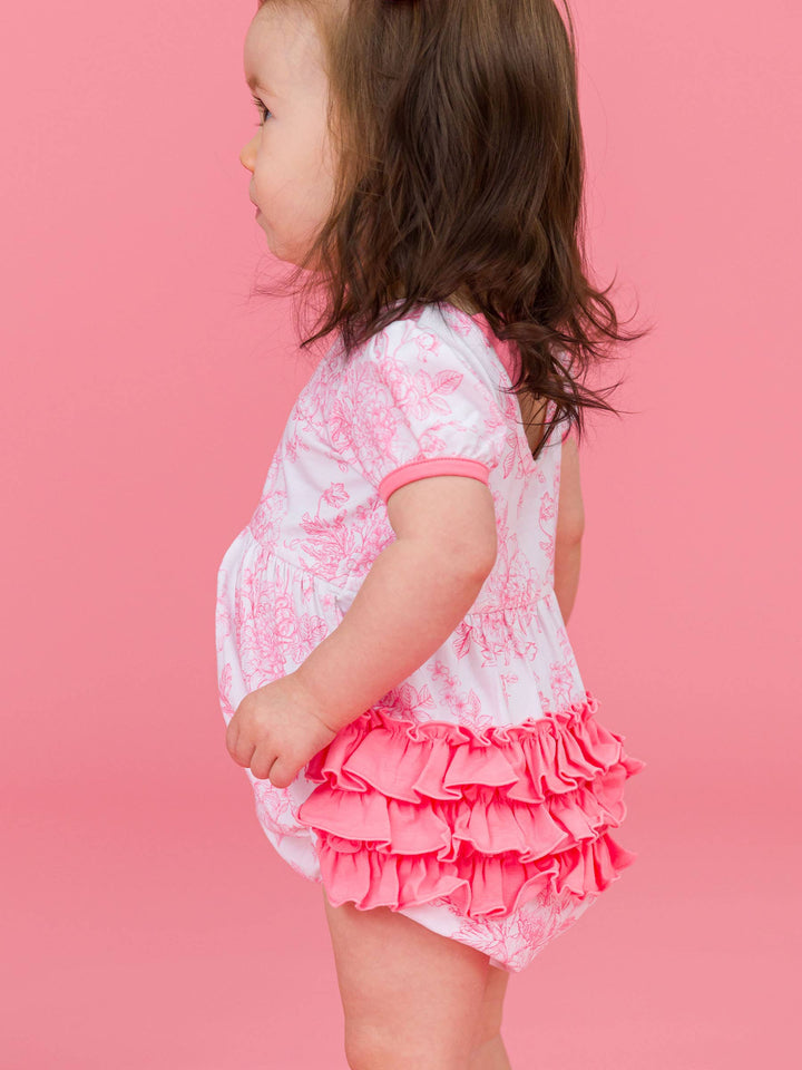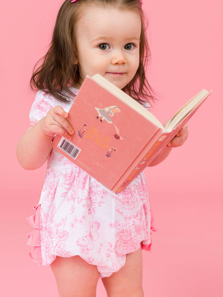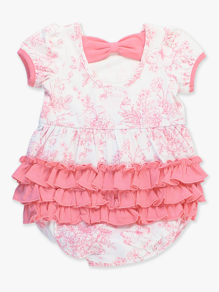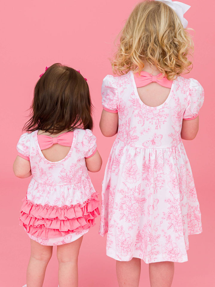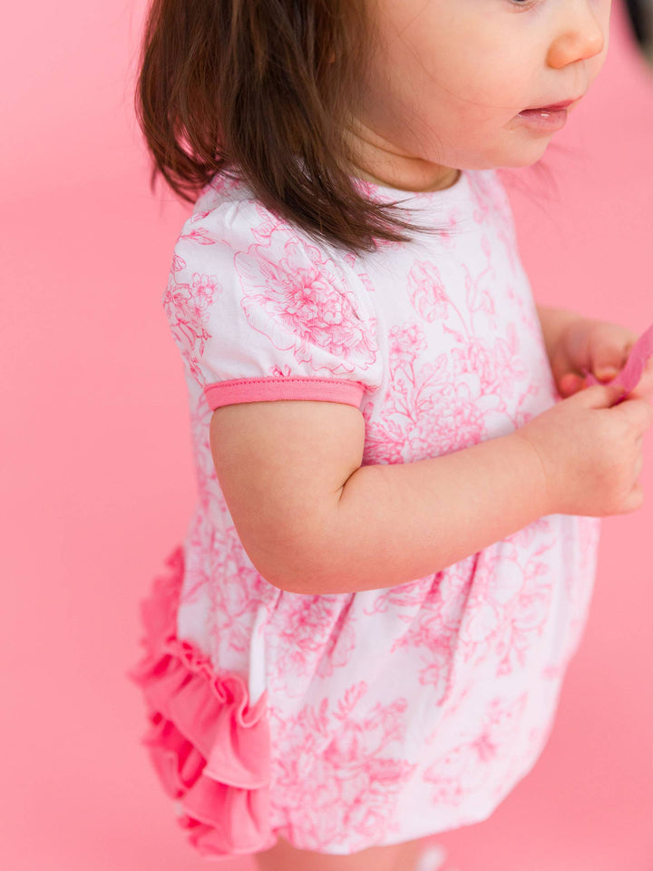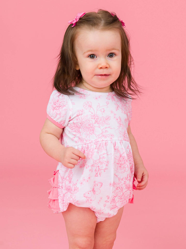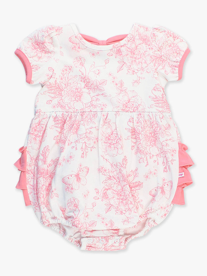 Baby Girls Bubblegum Pink Butterfly Garden Toile Puff Short Sleeve Bow Bubble Romper