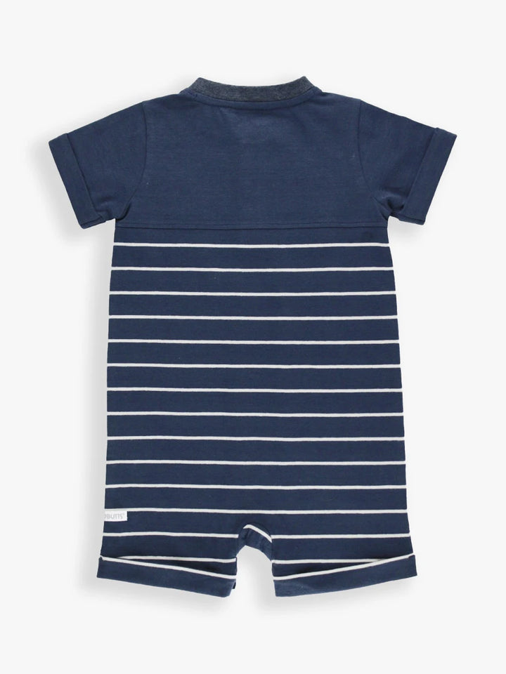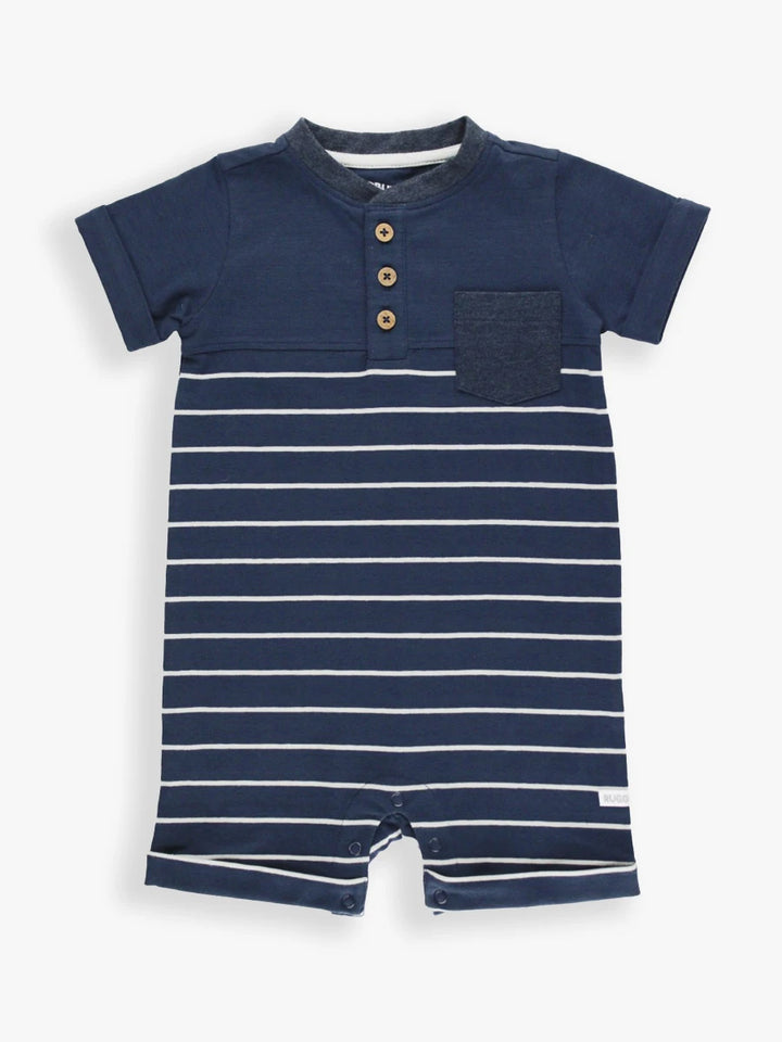 This romper is versatile enough to be paired with matching colors like white, black, blue, or pink. Whether it's for a casual day out or a cozy day in, this navy and gray stripe Henley romper is a classic addition to your boy's wardrobe.