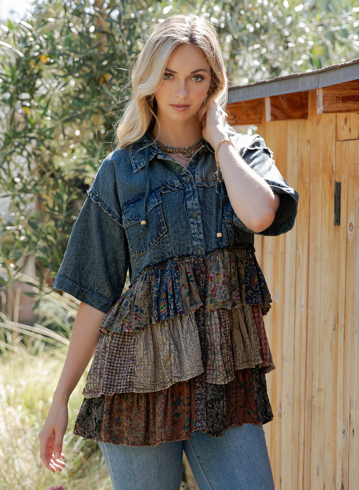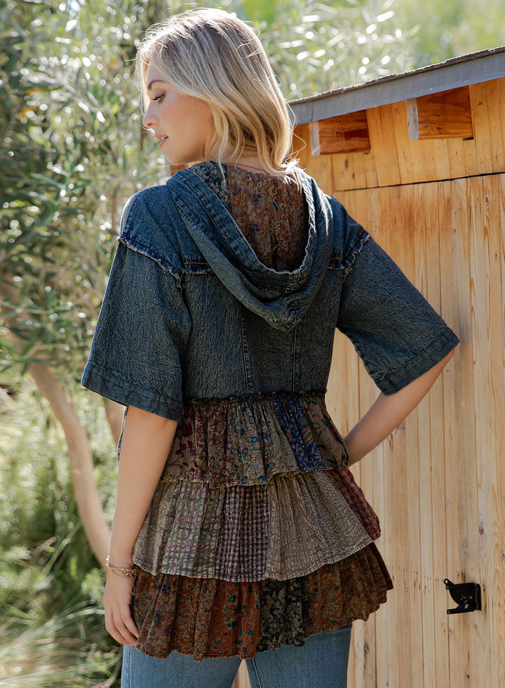 Style: Front-open denim shirt with ruffled hem. With Hoody Material: Sturdy denim with rayon printed & plaid ruffle panels Sleeves: Loose short sleeves for comfort and ease Ruffles: Layered from waist down, multi-patterned Design Detail: Mix & match of rayon prints and plaids Finish: Overdyed and washed for a vintage, soft feel Fit: Relaxed fit with dramatic flared bottom Closure: Button-down front Length: Hip to mid-thigh depending on size Wearability: Can be styled as a shirt, cover-up, or lightweight jacket Look: Bold Western boho fusion Occasion: Daywear, layering, travel, casual statement looks Care Instructions: Hand wash cold, tumble dry low or hang dry
