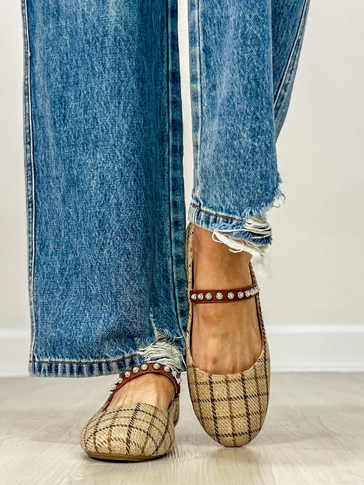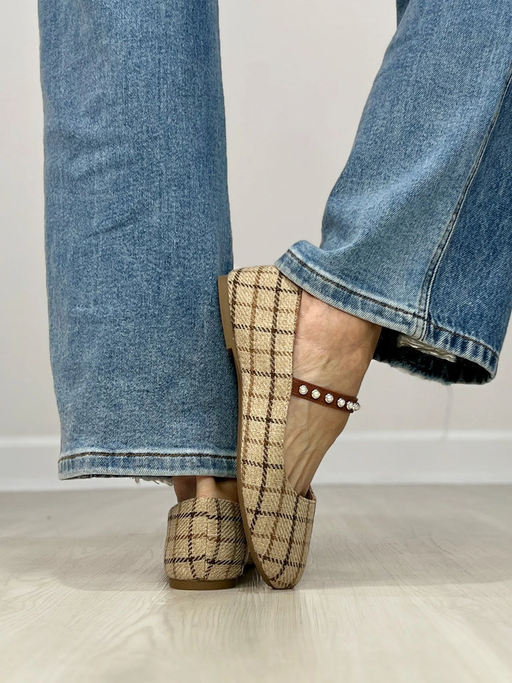 Bring charm and comfort to every step with the Corkys Tea Time flat. Designed in a timeless tan plaid pattern, this shoe blends classic style with modern detailing. The Mary Jane–inspired strap is embellished with pearl-like studs, adding a feminine touch while providing a secure fit. With its lightweight design and cushioned insole, this flat is perfect for both casual outings and dressier occasions. Pair it with jeans, skirts, or dresses for a polished look with everyday ease.