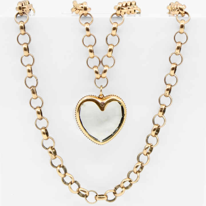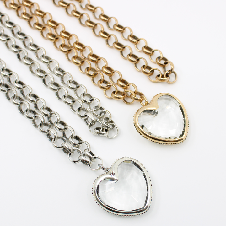 Chunky (but lightweight!) rollo chain necklace with large clear crystal heart pendant, insignia stamp on reverse; available in 2 finish options.