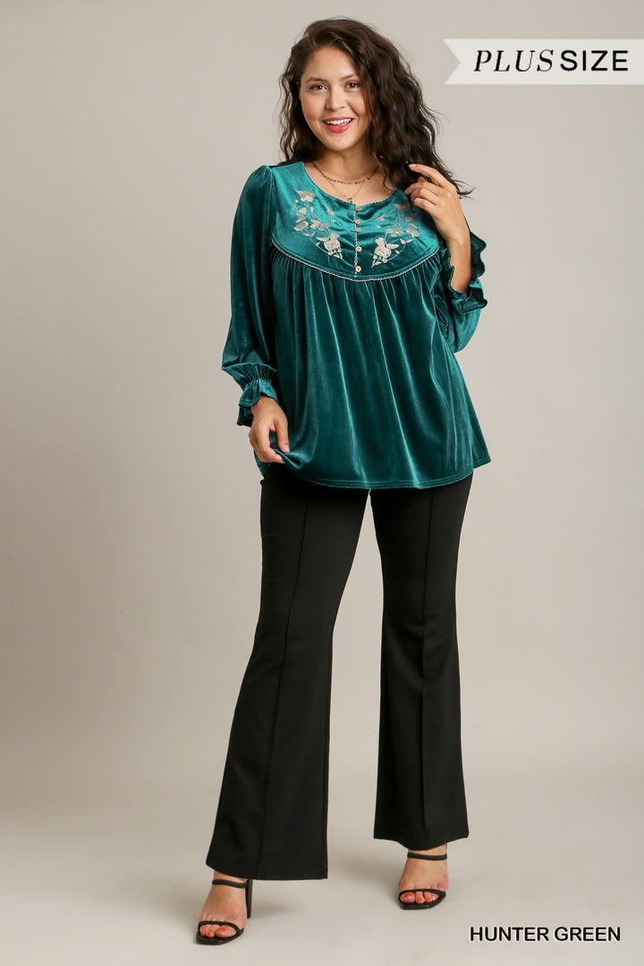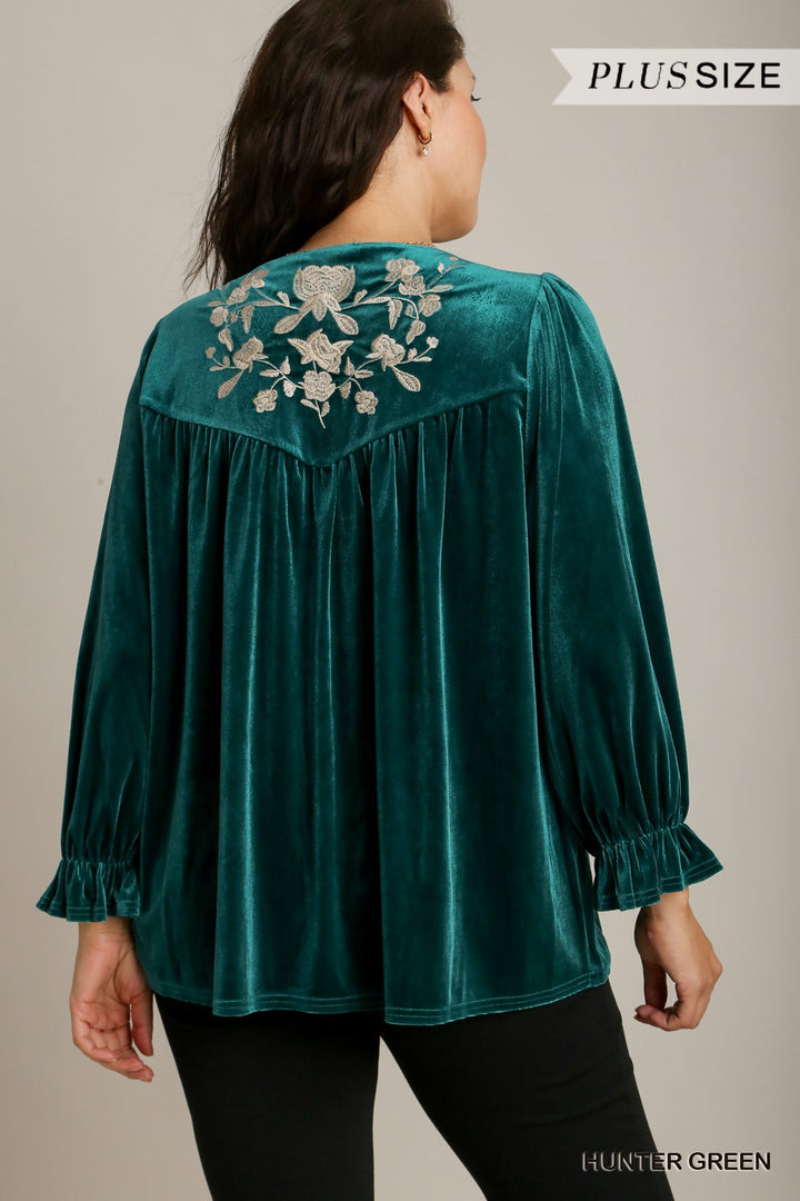 Velvet Embroidery Top with Cuffed Ruffle Sleeves