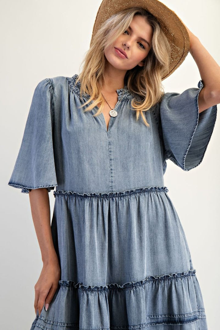 WING SLVS WASHED DENIM MAXI DRESS-RELAXED, FLOWY FIT WITH A TIERED SKIRT-V-NECKLINE-RAW-EDGE FRAYED FINISHING-SIDE POCKETS-PERFECT FALL DRESSES-SMALL MEASUREMENTS : LENGTH - 47.25" & BUST - 19.75"