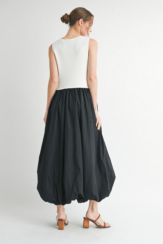 Sleeveless color block bubble bottom maxi dress with front bow tie detail, side pockets. - Model is 5'10'' and is wearing a Small.