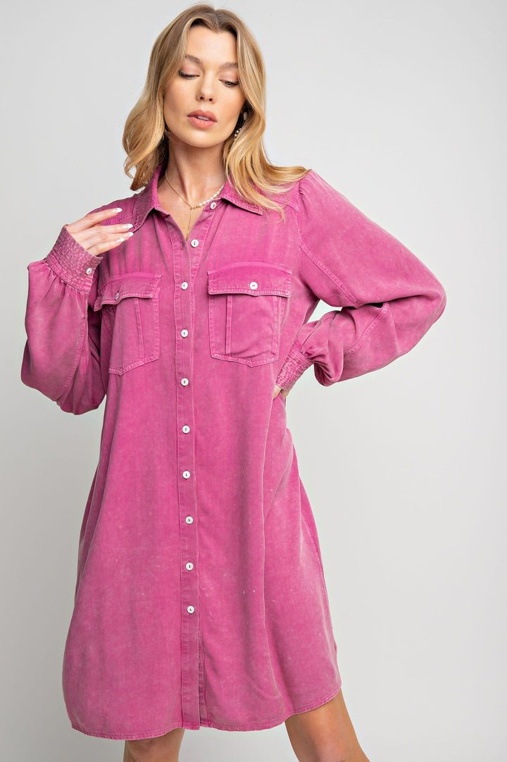 -COLLARED NECKLINE -BUTTON DOWN CLOSURE -FRONT POCKETS -BUBBLE SLEEVES WITH BUTTON -RUCHED AND PLEATED -LIGHTWEIGHT AND SWINGY -STRAIGHT LINE SILHOUETTE