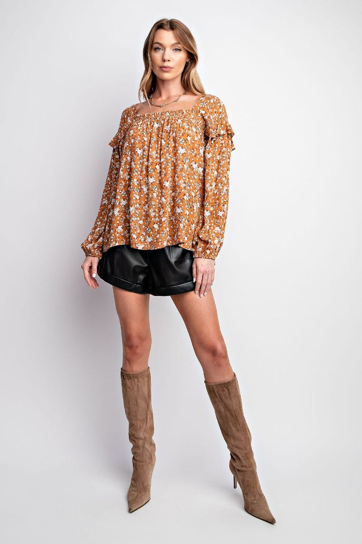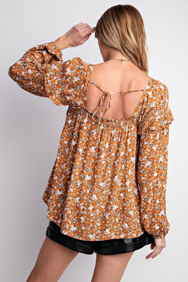 Description:FLORAL PRINTED LOOSE FIT TOP -SQUARE NECKLINE AND SMOCKED DETAILING -RELAXED AND LOOSE FIT -TIE CLOSURE BACK -RUFFLE DETAILING AT SHOULDERS -RAYON GAUZE FABRICATION -MODEL HEIGHT 5'10