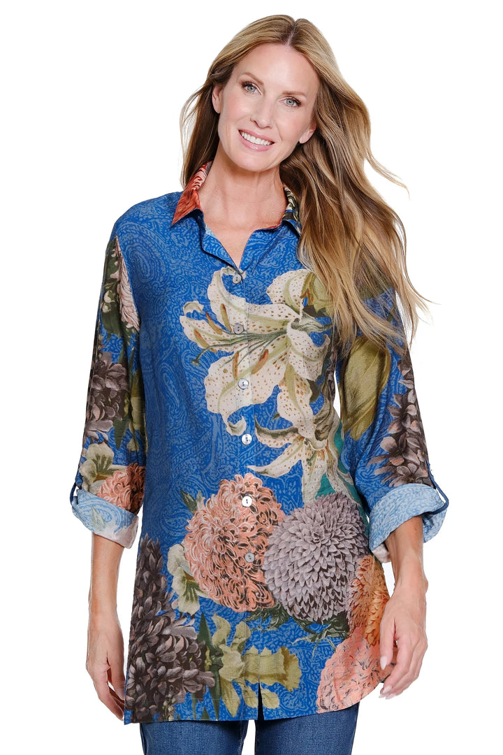 Feminine and timeless, this floral print top is designed with a button-front closure and long sleeves for effortless style. Crafted from a lightweight rayon-nylon blend, it drapes beautifully for all-day comfort.