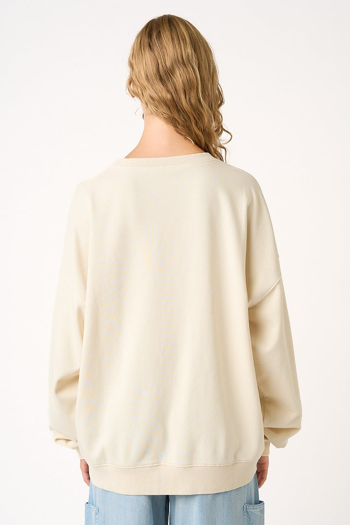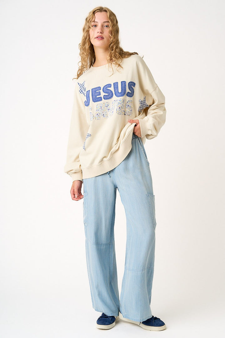 - COTTON FRENCH TERRY KNIT FABRIC - MINERAL WASH, GINGHAM, AND FLORAL PRINT PATCHWORK DETAIL - STAR PATCHES - JESUS SAVES LETTERING PATCHWORK - CREW NECK - DROP SHOULDER - LONG SLEEVE - BANDED HEM AND CUFFS - LOOSE FIT SWEATSHIRT MODEL IS 5'8" AND WEARING SIZE SMALL