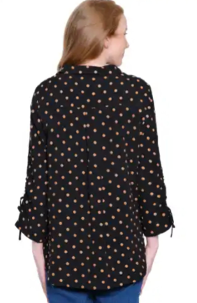 Classic with a playful twist, this embroidered dot top brings subtle texture and charm to your everyday look. Featuring an allover embroidered dot design, a button-front closure, and cinch tie 3/4 sleeves, it blends timeless style with modern details. Crafted from a lightweight rayon/nylon blend, it offers breathable comfort with a soft, flattering drape.