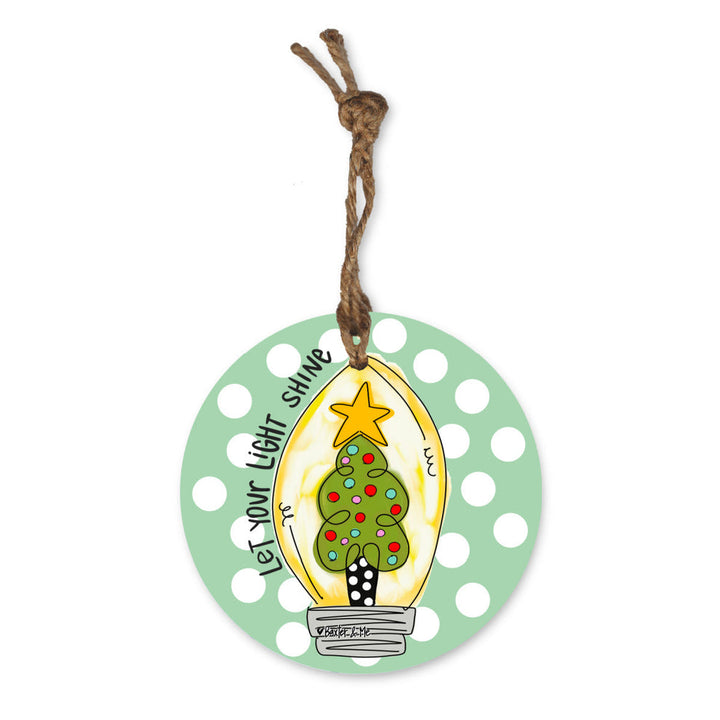 Each round ornament measures 5" in diameter and includes a hand-tied jute hanger.