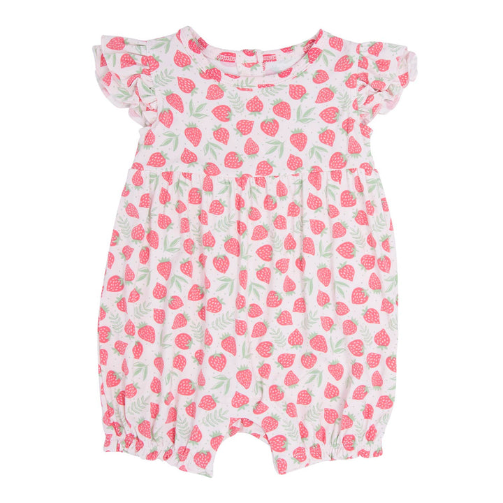 Finished to Perfection This darling day romper elevates the cuteness of each tumble and fumble. Your sweet cheeked little cutie pie will love this summer romper. Flutter tank sleeves and high thigh length Snap closure inseam and back placket