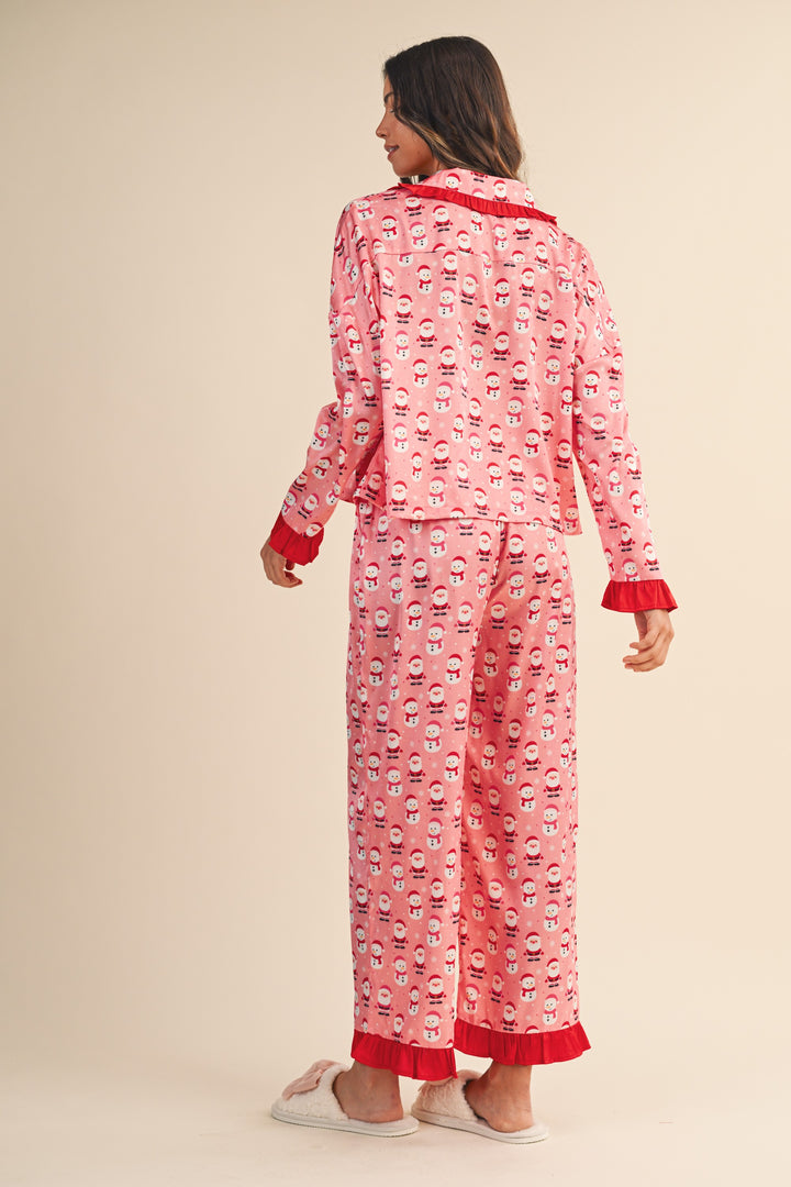 CHRISTMAS SANTA PRINT SATIN RUFFLE PAJAMA - SATIN TIE ATTACHED - BUTTON FRONT CLOSURE - ELASTICIZED WAIST - PATCH POCKET&SIDE POCKET - RELAXED COMFORT FIT