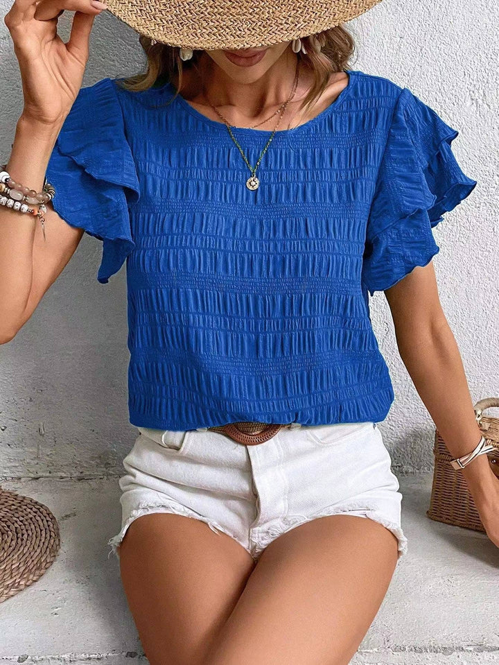 Unleash your style with our Textured Ruffle Sleeve Blouse from Miss Sparkling. This blouse, a product of our exclusive in-house designs, captures the essence of our southern California roots. Always evolving with the trends, our blouse combines novelty knitwear designs and retro-inspired techniques, making it a perfect addition to your wardrobe.