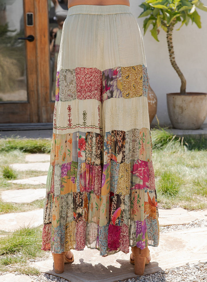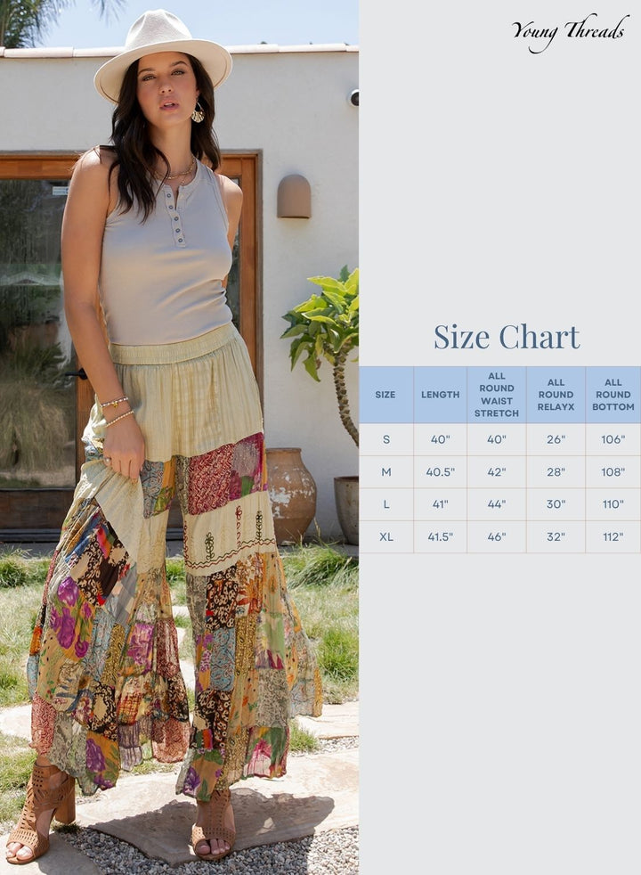 Style: Boho flared tiered pants with patchwork Material: Mixed prints, plain jacquards, and soft rayon fabrics Embroidery: One panel features delicate embroidery Design: Tiered silhouette with flared hem and artistic fabric medley Length: Full length Texture: Light, flowy, and softly textured Comfort: Relaxed fit with all-day ease and movement Care Instruction: Machine wash cold, gentle cycle line dry Details: Unique patchwork layout, embroidered detail, flowy drape