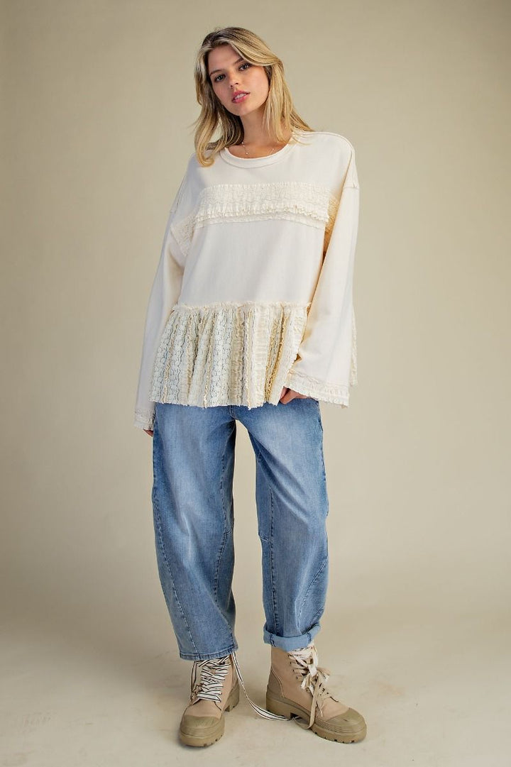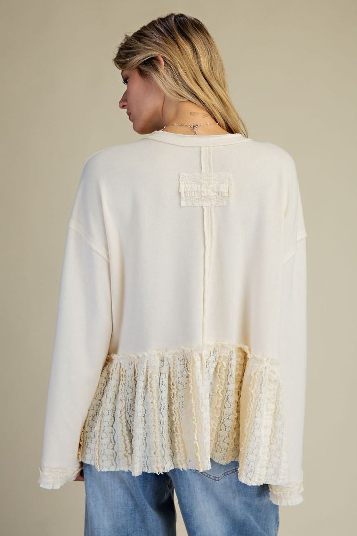 SOFT WASHED TERRY KNIT PULLOVER TUNIC-ROUND CREW NECKLINE-LACE RUFFLE DETAIL-LOOSE, FLOWY SILHOUETTE-SMALL MEASUREMENTS : LENGTH - 26" & BUST - 24.5"